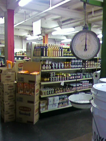 Fridays I often have some time alone with Mini-Me. Today we seem to have had an all food morning. This is good, we're getting her up to speed young! First thing after she woke up, we made our favorite biscuits. Properly nourished and ready for adventure we headed off to Big John's (aka Pacific Food Importers). If you are anywhere near Seattle and you don't know about PFI, you should run, don't walk. They have a tremendous selection of food from Europe and the Middle East, in bulk, frozen, and jarred, and a phenomenal cheese selection, knowledgeable staff, and great prices. They supply many of the best restaurants in the city. Above is a picture of today's ill-gotten gain: Preserved lemons, Adjvar, Beemster XO Aged Gouda, the house brand Marca Croce olive oil, unbelievably fragagrant sumac powder, Guittard chocolate, and more. Kiddo had a fun time talking to everyone and sampling the chocolate. And here's a cell phone pic inside the store, to give you the general warehouse flavor. Needless to say, after all that hard work shopping it was time for a lunch, so we went to....