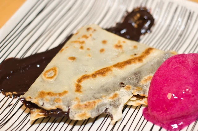 While tasty enough to eat out of hand, at that price I don't think many of us will be slicing pitaya up for an everyday breakfast. It would definitely be attention grabbing in a fruit salad or as a garnish. After puzzling about what I wanted to do with it, I landed on a quick sorbet that I served with a crepe filled with chocolate ganache. To make the the sorbet I just pureed the flesh with quite a bit of honey and a few grains of sea salt, and pushed it through a fine meshed sieve. You could put it in an ice cream maker, but I was in a hurry, so I poured it out on a baking sheet, set it level in the freezer, and agitated it with a fork every few minutes while I prepared the crepes, until it firmed up nicely. The sorbet developed a slightly gelatinous texture, which I liked but some (Snacky Pants, are you with me?) might find unappealing. That must be due to some chemical property of the fruit, but I don't know the technical explanation. I think it would also make a great ice cream, though of course the color would become pastel. If I made it again I think I would use agave nectar instead of honey for the milder flavor and the nice symmetry of using two cactus-based ingredients. Shot of tequila anyone?