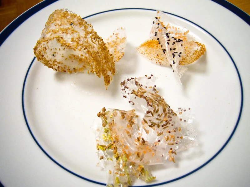 Modernist cuisine wizards can make isomalt into paper thin vessels filled with liquids, and I had hoped to make a sort of creme brulee capsule at some point. But for my first foray, I thought I would make some simple croquants (think: peanut brittle) with various spice mixtures. The idea would be to garnish a dish with them, allowing the eater to snack on them directly or crumble over a dish.