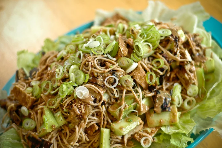 These otsu noodles are a cool and refreshing combination of soba (buckwheat) noodles with a sesame dressing and lots of veggies.