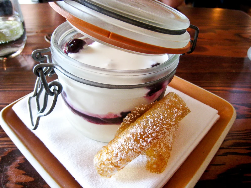 And for dessert, vanilla bean cheesecake in a jar. Pastry chef Deanie Fox has found a beautiful way to simultaneously maximize the clean, sweet dairy flavor while taking some of the unwanted heft out of the classic cheesecake. A perfect cool finish before walking back out into the hot Napa sun.