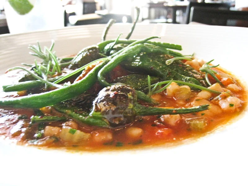 This dish of fregola resembled a traditional entree more than anything else we sampled, and of course the kitchen chose quite rightly to send it last. Fregola is a Sardinian toasted pasta, served in a tomato broth with carrots, onions and celery and topped with grilled Spanish Padron peppers and green beans, along with agretti - the bit that looks kind of like rosemary in the picture above, but is actually a succulent. I wish I had a reliable source of Padron peppers here in Seattle. They have a complex, green flavor with minimal heat (at least in this batch, apparently later in the year they can be muy picante).