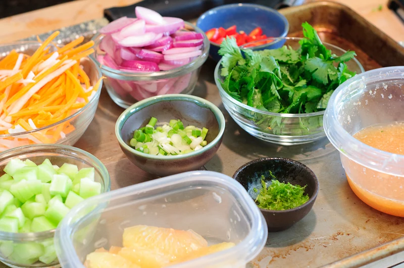 - To assemble, divide the lettuce among 4 large bowls. Top each with a big handful of the rice noodles. Then top with an attractive arrangement of the remaining ingredients: tofu, grapefruit supremes, mango carrot/daikon salad, chile pepper, cucumber and finally the shallot rings, green onion, and cilantro and lime zest. You can either pour on the sauce yourself or divide into individual bowls for your guests to add as they see fit. Offer Sriracha-type hot sauce on the side.