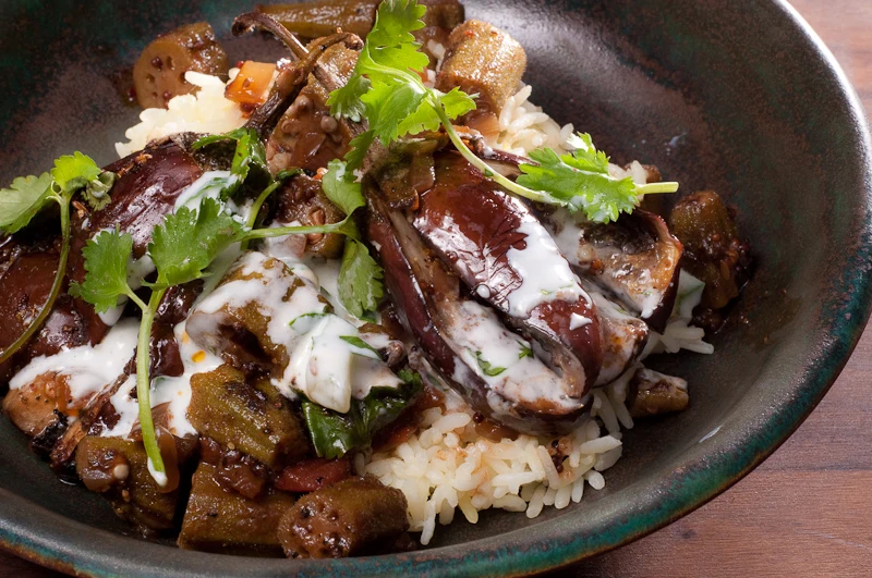 Tiny Eggplant and Okra in Lime-Scented Tamarind Sauce - Recipe