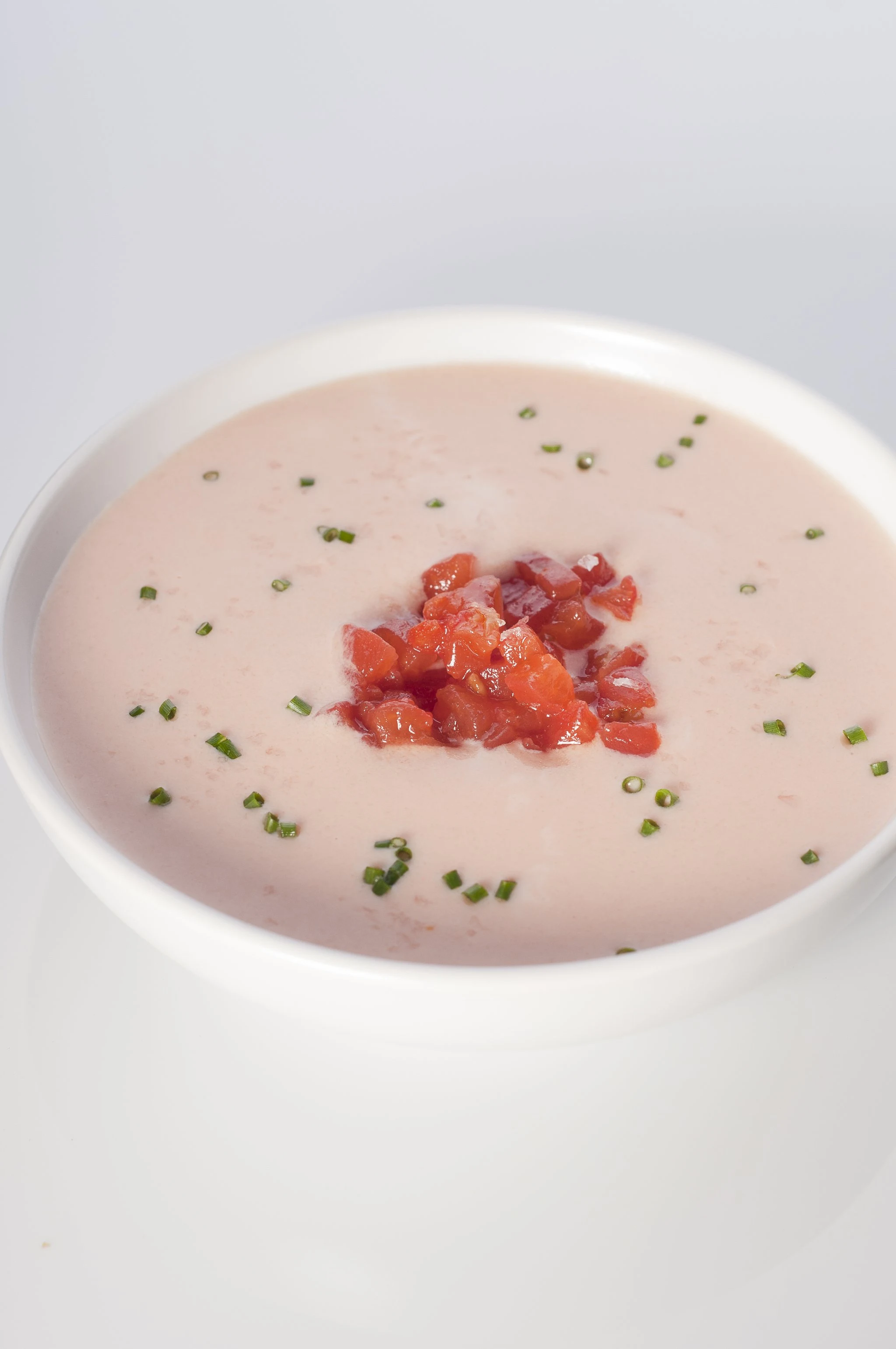 - Divide the soup among the bowls; garnish each one with some chopped confit, chives, a drizzle of olive oil, and a few flakes of salt. Serve immediately.
