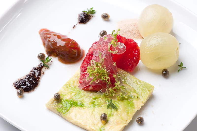 The thing I like about the combination of ingredients I landed on is that you can eat them “safe” (the avocado with the lime, tomatoes with olives, ….), or you can take the invitation to play a little bit. How do grape and avocado taste together? Blood orange and tomato gel?