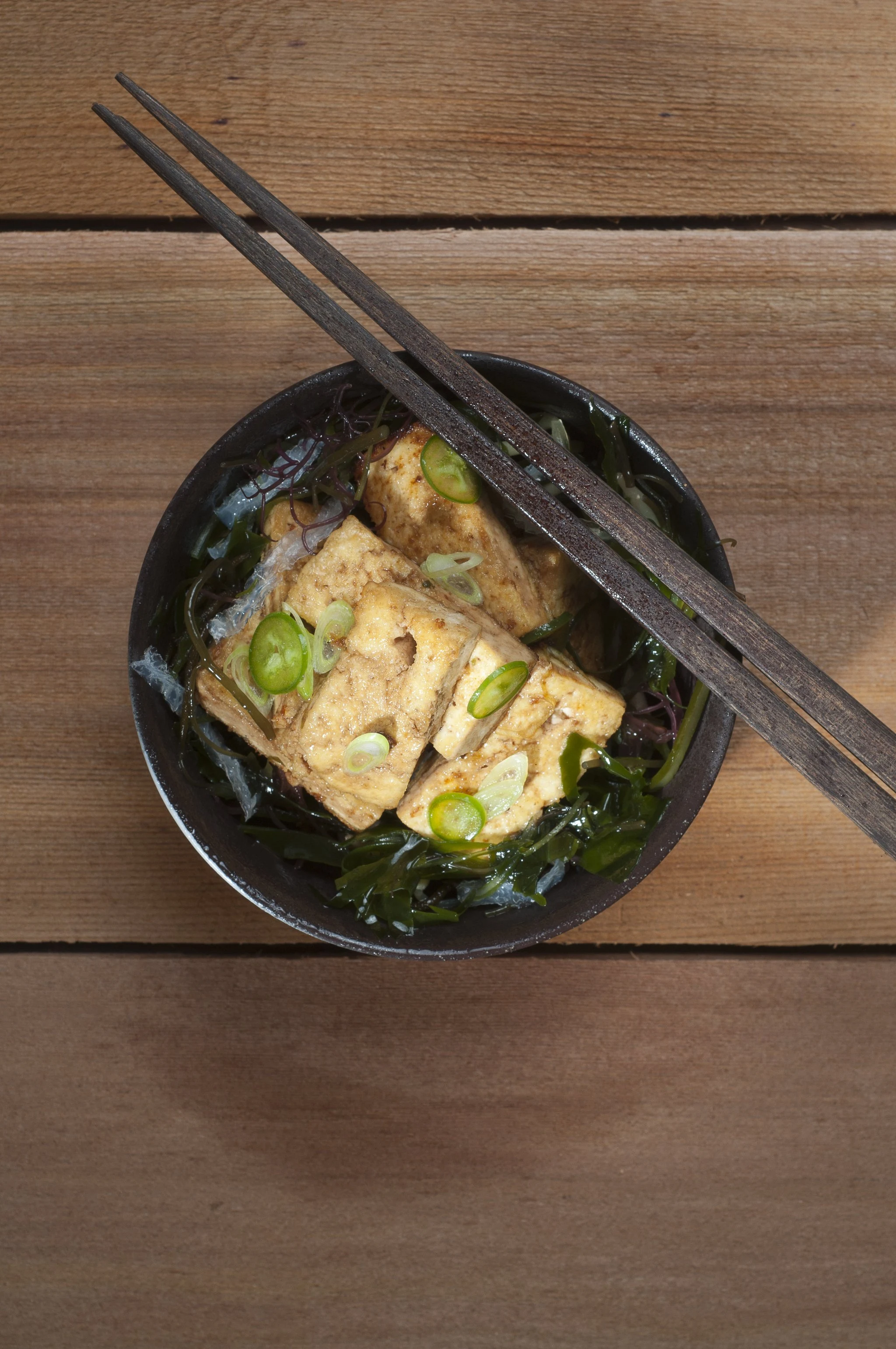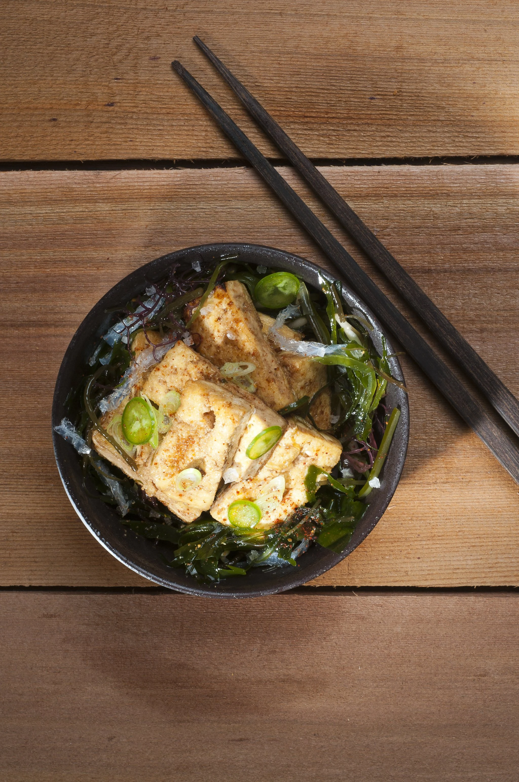 - To serve, divide the bean sprouts among 4 bowls. Drain and pat dry the seaweed and place a small mound atop the bean sprouts. Cover that with the tofu and drizzle on some of the remaining sauce. Garnish with the remaining green onion and jalapeno and a few grains of Hawaiian sea salt.