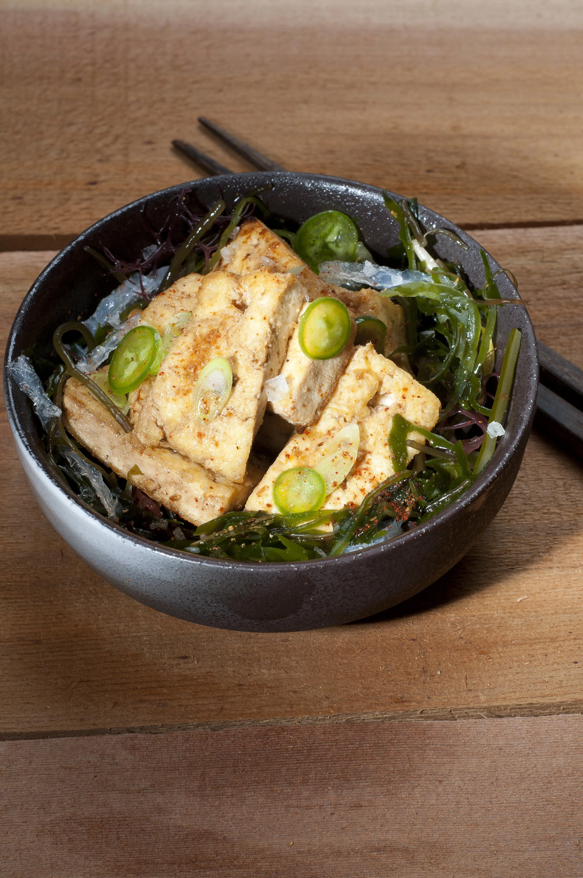 Poke (pronounced POH-keh) is the Hawaiian equivalent of sashimi or crudo. Poke is typically raw fish, seasoned with soy and onion, often on a bed of seaweed. This vegetarian version is made with seared tofu, which matches those Asian flavors perfectly.