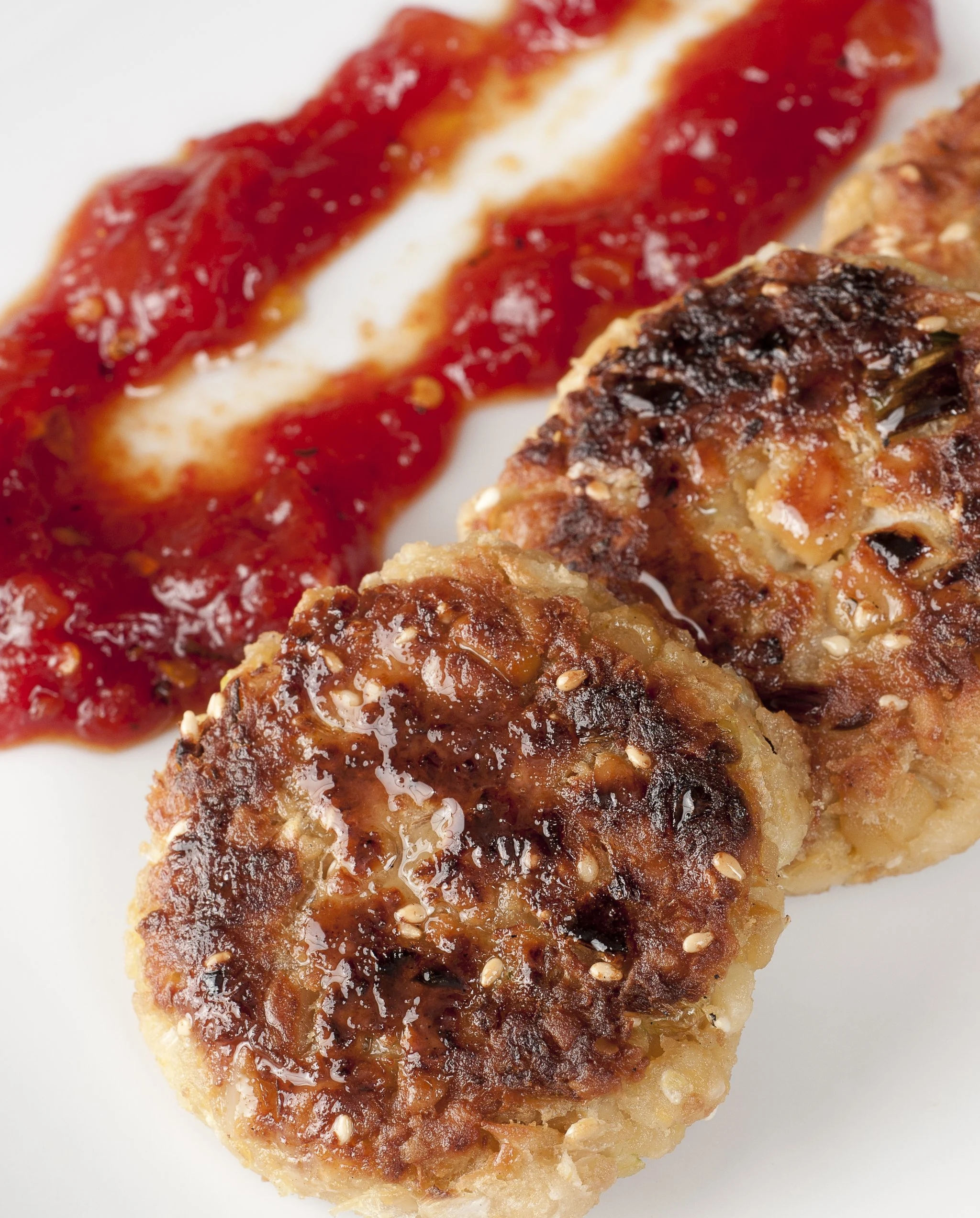 - Combine all ingredients except the oil and flaky sea salt in a food processor and buzz until you have a fairly uniform mixture, but stop before it is completely pureed. We want some texture left. You should be able to form it into a ball that holds its shape. It should be neither crumbly nor a batter. Add liquid or breadcrumbs as necessary to find the right moisture level.