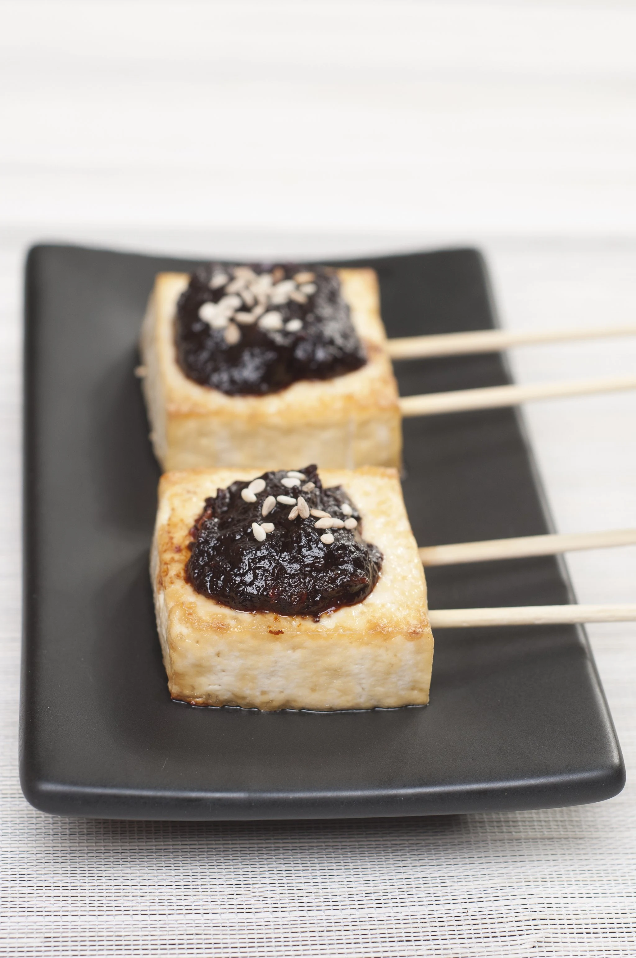 These broiled tofu skewers are a street food in Japan, grilled over wickedly hot charcoal. You can create a similar effect using your broiler. If you do it this way, it is still fun to add the skewers afterwards so diners can pick them up to eat. Of course if you have a grill going, go ahead and use it for the smoky flavor, just oil the tofu well so it doesn’t stick, and put in the skewers first.