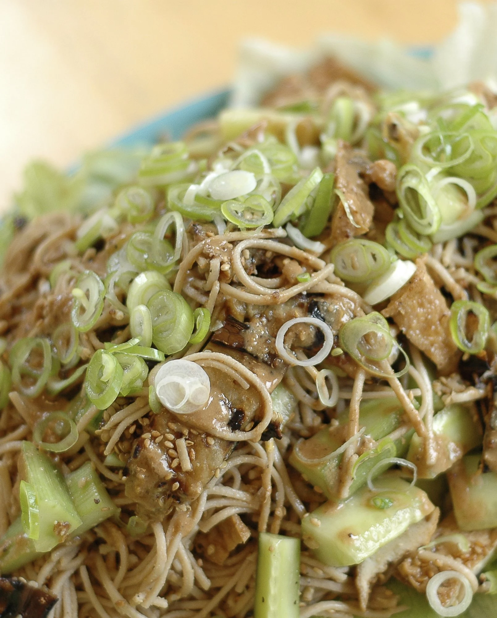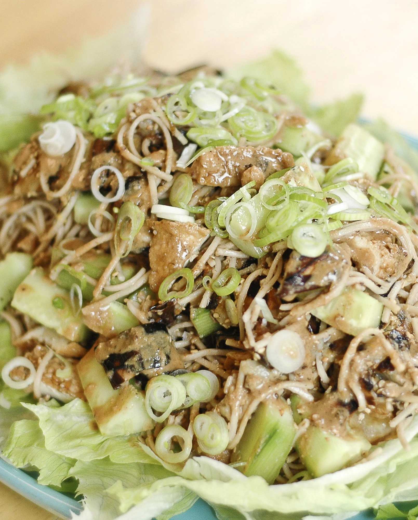 - To serve, line a bowl or platter with the iceberg lettuce and mound the noodles on top. It can be hard to get the vegetables to mix in, so you may need to take your tongs and distribute them a bit. Garnish (in order) with: the remaining sauce, the green onions, the remaining sesame seeds, and a couple pinches of good sea salt and a grind of black pepper.