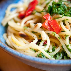 - Divide the pasta among the serving bowls, garnish with the toasted pine nuts and parsley and serve immediately.