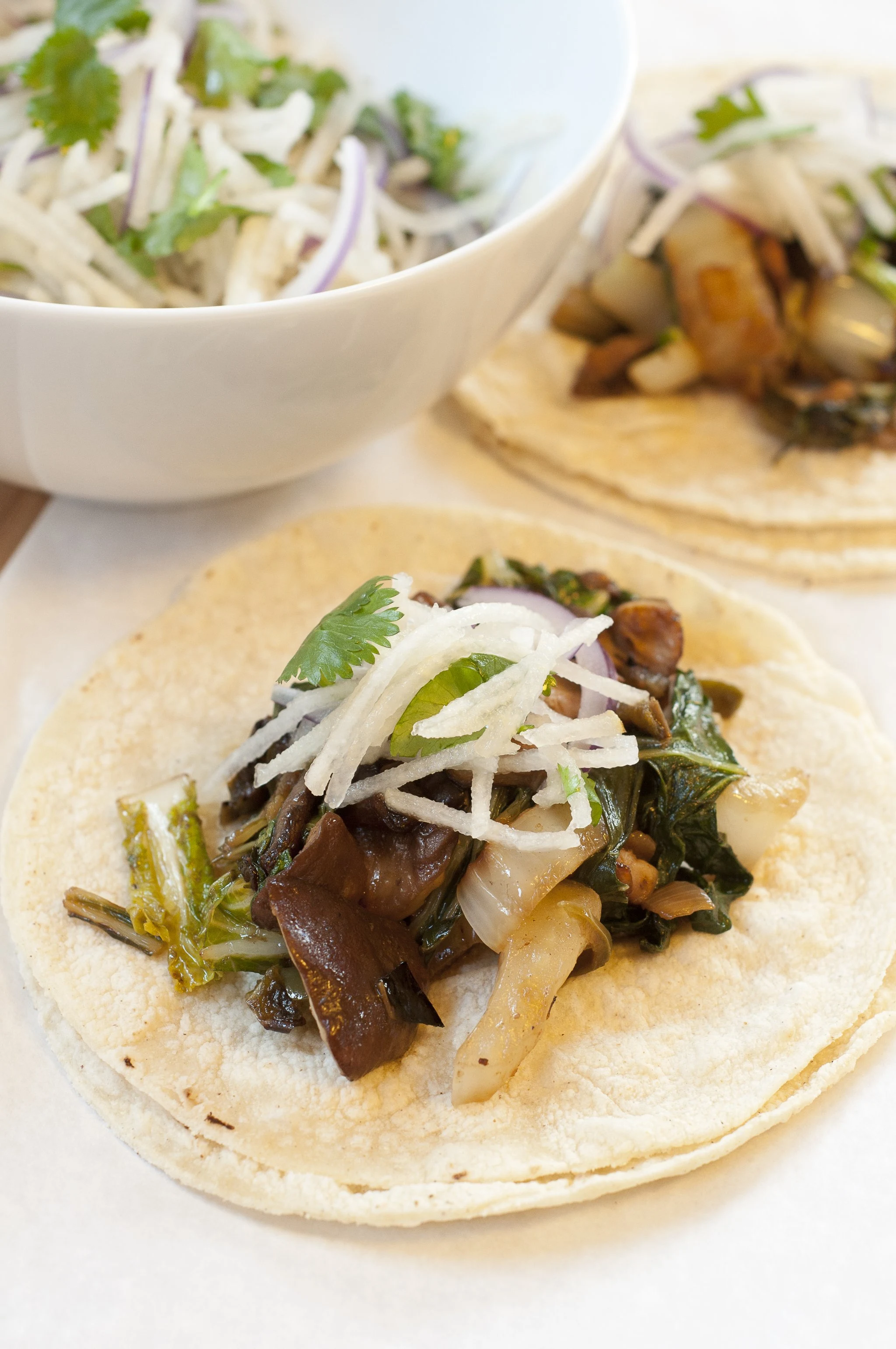 - Wrap the corn tortillas in a lightly moistened towel and microwave until soft and steaming, about 2 minutes. To serve, make 8 stacks of two tortillas each. Top each pair of tortillas with a big spoonful of the shiitakes, and a smaller spoonful of the slaw, and serve immediately.