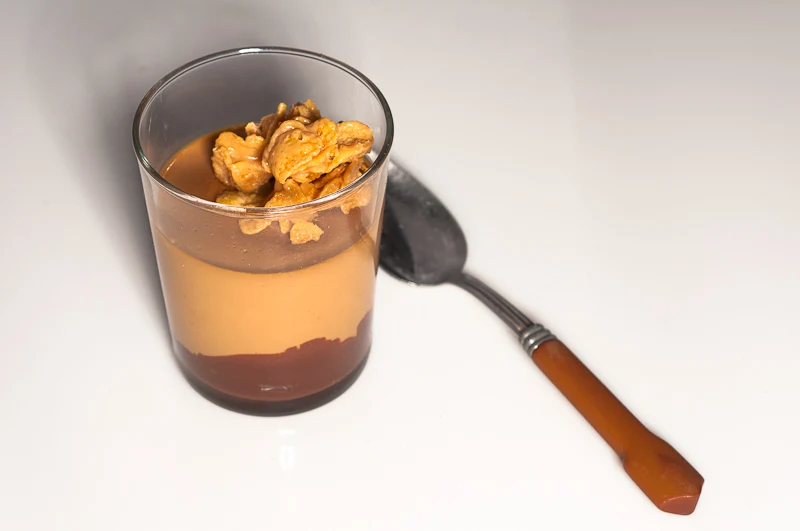 Butterscotch Pudding with Bittersweet Ganache and Caramelize White Chocolate CrunchiesVegetarian and kosher Serves 4
