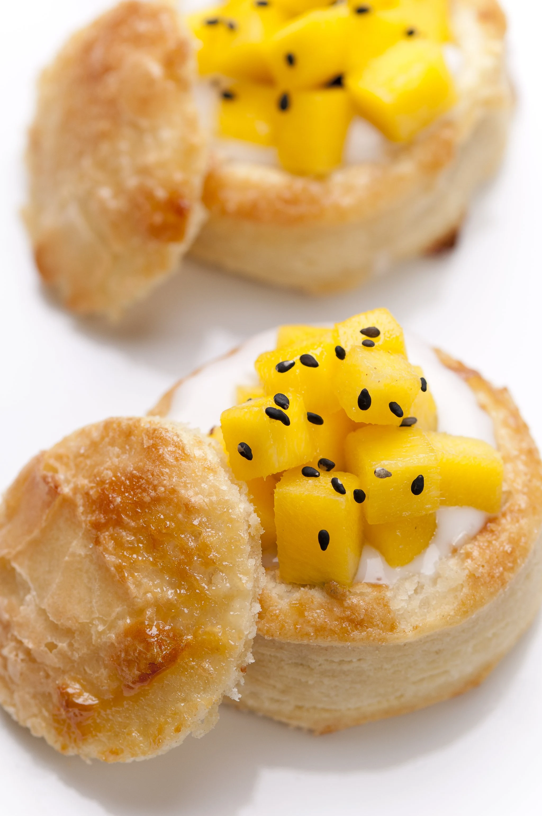 - To assemble, take one pastry shell and use a sharp paring knife to cut a circle out of the top, leaving a 3/8” rim all the way around. Carefully lift off the “lid” and reserve. Spoon in a tablespoon of the chilled pudding. Put ½ teaspoon black sesame paste in the center of the pudding. Spoon on two tablespoons of the mango and sprinkle with the black sesame seeds. Repeat for the remaining shells. Serve immediately.